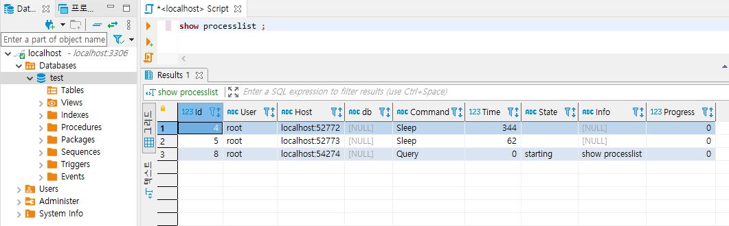 DB 접속 리스트를 확인하는 쿼리를 실행한다.