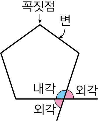 - 외각 : 다각형의 각 꼭짓점에서 한 변과 그 변에 이웃하는 변의 연장선이 이루는 각