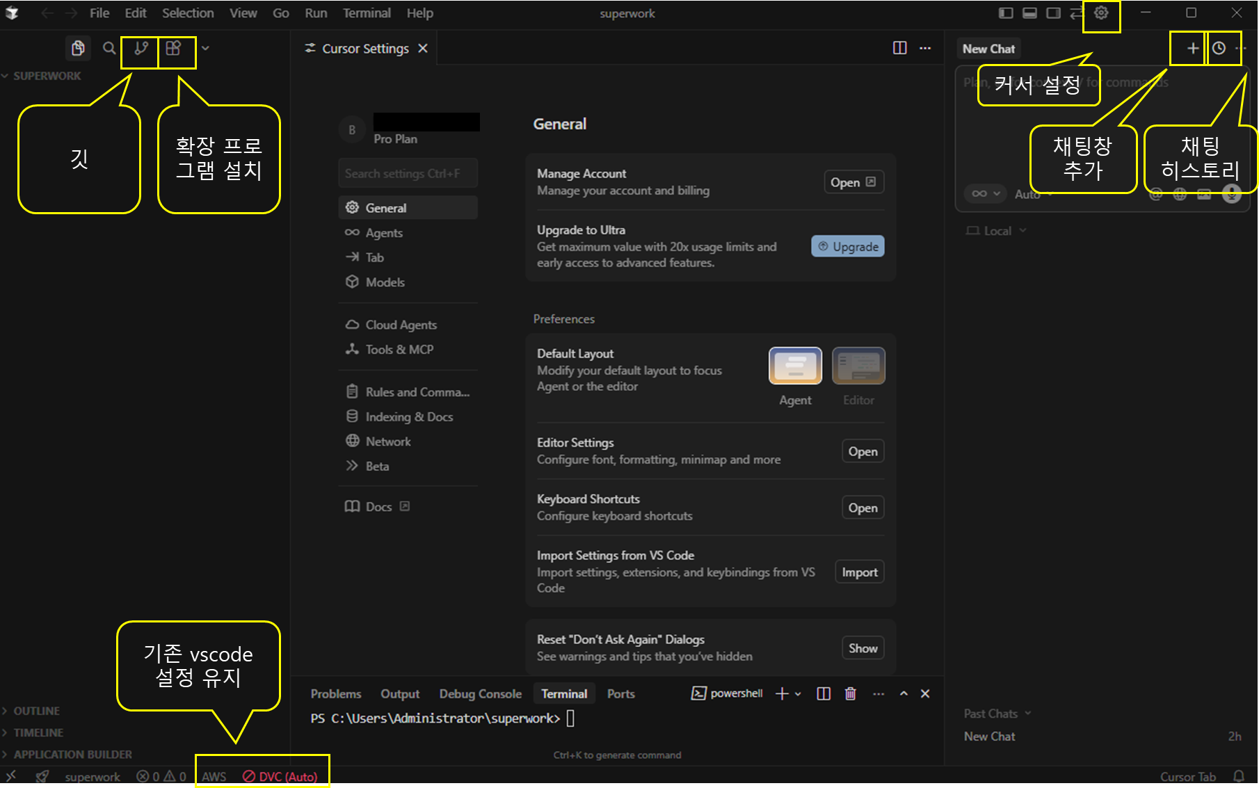 - 기존의 다른 IDE와의 차이는 우측에 채팅이 있다는 점이다.