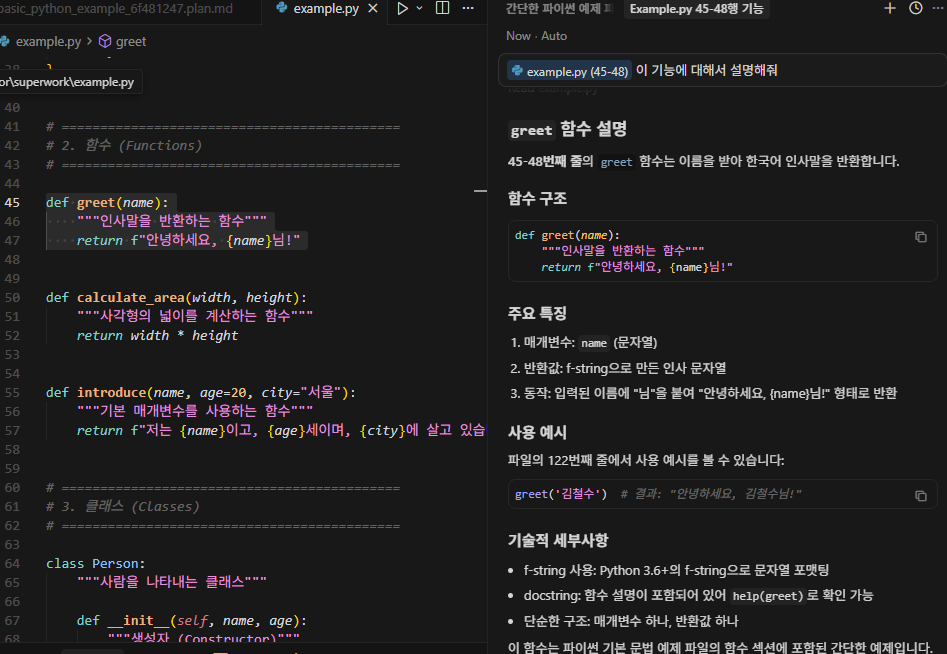 채팅창에 해당 부분의 코드가 컨텍스트 윈도우로 설정되어 이 부분에 대한 질의를 할 수 있고,