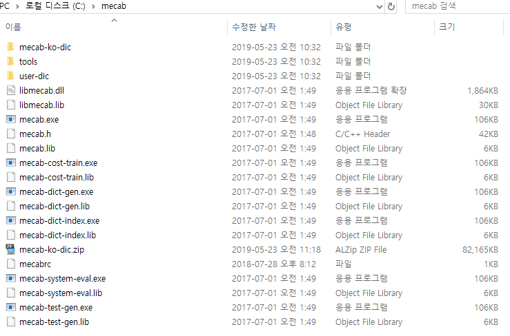 1-4. '1-2'에서 다운로드 받은 'mecab-ko-msvc-x64.zip' 또는 'mecab-ko-msvc-x84.zip' 압축풀기