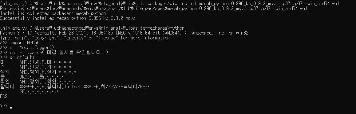 [참고] anaconda 특정 가상환경에서 wheel 설치 후 MeCab 설치 확인하기