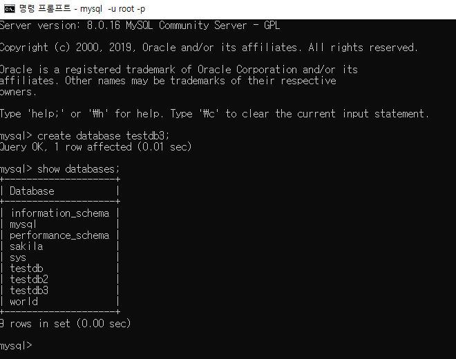2) CMD 에서 'mysql -u root -p' 치고 비밀번호 입력하여 연동되는지 확인