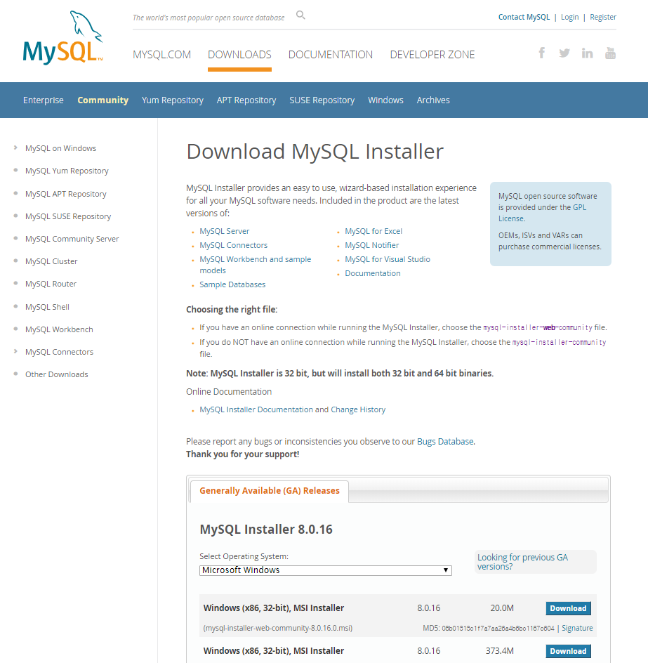 Download MySQL Installer Please report any bugs or inconsistencies you observe to our Bugs Database. Thank you for your support!