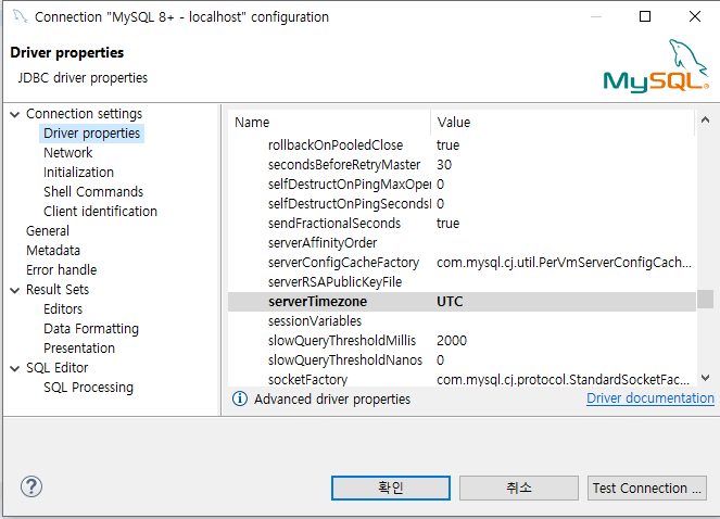 2) 서버 타임존(time zone) 에러 => 스키마의 타임서버존에 'UTC' 붙여주기 / 8버전에서만 에러가 나는 것 같음
