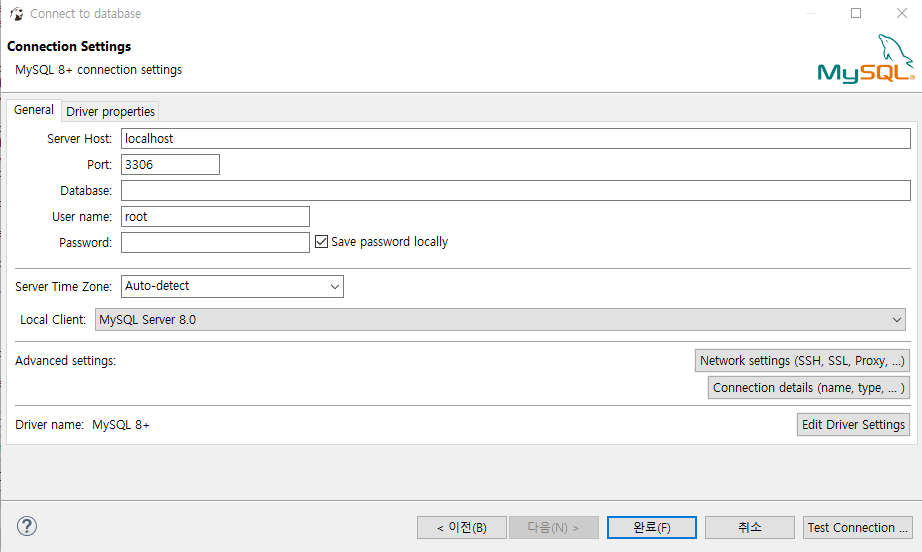 database명 / user명 / password 기입 > 완료